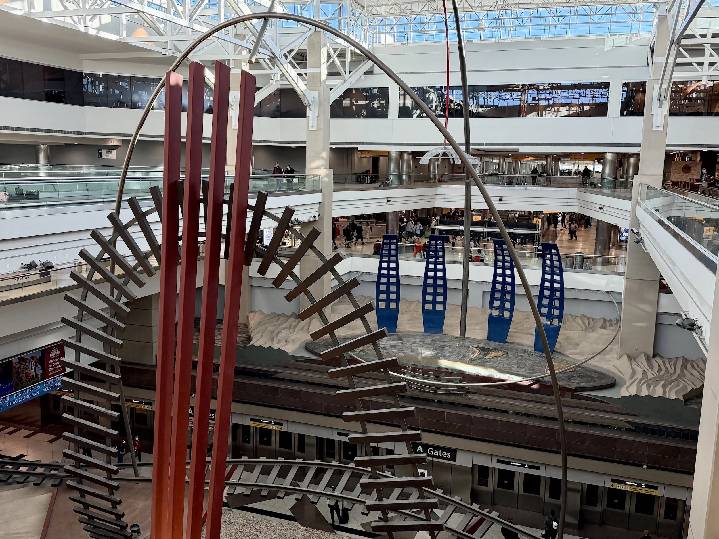 There’s one piece of public art that you can only see from a distance at DiA. That’s “Mustang,” the striking—some would say demonic—blue horse sculpture that provided our lead-in. It stands on the median in Peña Boulevard, which loops around in front of the airport, but there’s no pedestrian path leading out to it. Unfortunately, that means you can’t get up close to the horse to take pictures, look up its nostrils, or see details like its private parts. For anyone on a layover like we were, your best bet for seeing “Mustang,” aka Blucifer, would probably be to hail an Uber or Lyft ride.