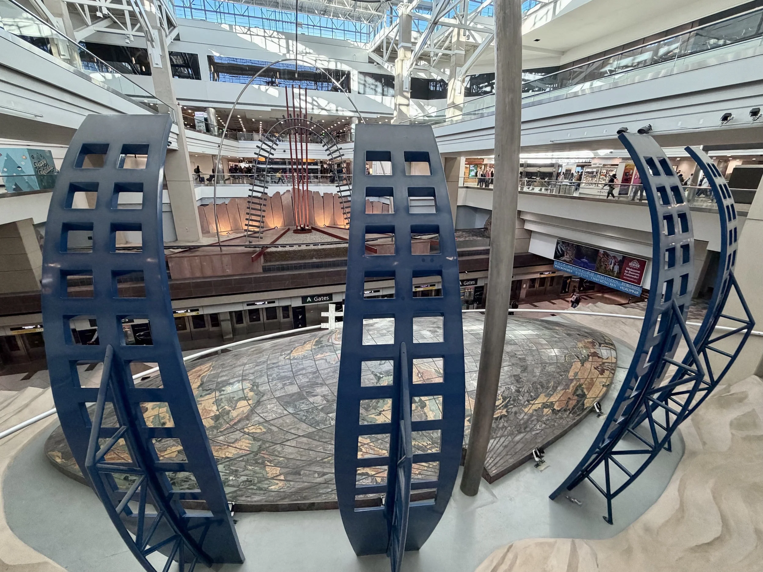 From a plane window above Denver, you should be able to confirm with your own two eyes that the earth has curvature and is not, in fact, flat. In 2023, however, claims began making the rounds on TikTok that a new piece of public art in DIA, featuring train tracks and a global map on raised tiles, somehow vindicated the flat-Earth conspiracy theory. The transportation-themed artwork is called “Dual Meridian,” and you’ll find it in the center of Concourse A, which is linked to Jeppesen Terminal via a pedestrian bridge.
