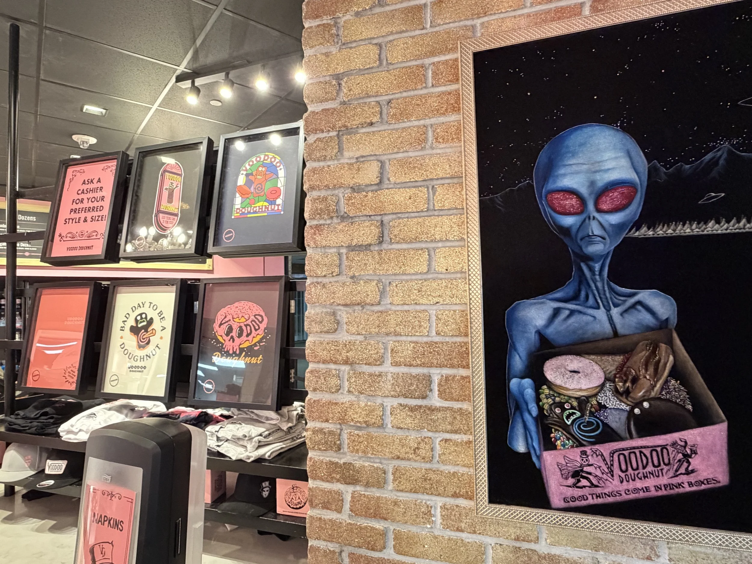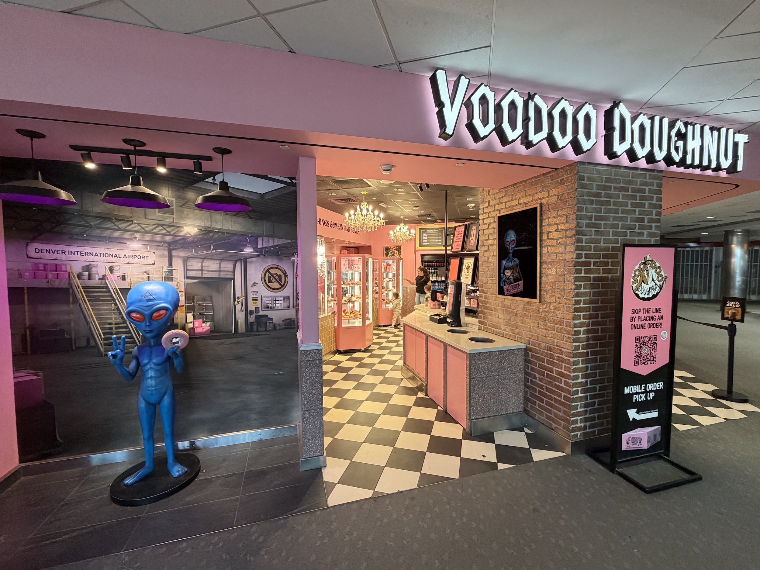 As it happens, you can see an alien in DIA, even posing for selfies with it. The photo op is in the center of Concourse B, up on the mezzanine level outside Voodoo Doughnut. When this Portland-based chain started expanding beyond Oregon, it opened its first out-of-state branch in Denver. The founders set out to achieve “world doughnut domination,” so maybe they’re part of the New World Order like the Freemasons. According to The Los Angeles Times, they used to openly sell doughnuts laced with Nyquil, and really, what better way to sedate the masses in a fast-food nation?