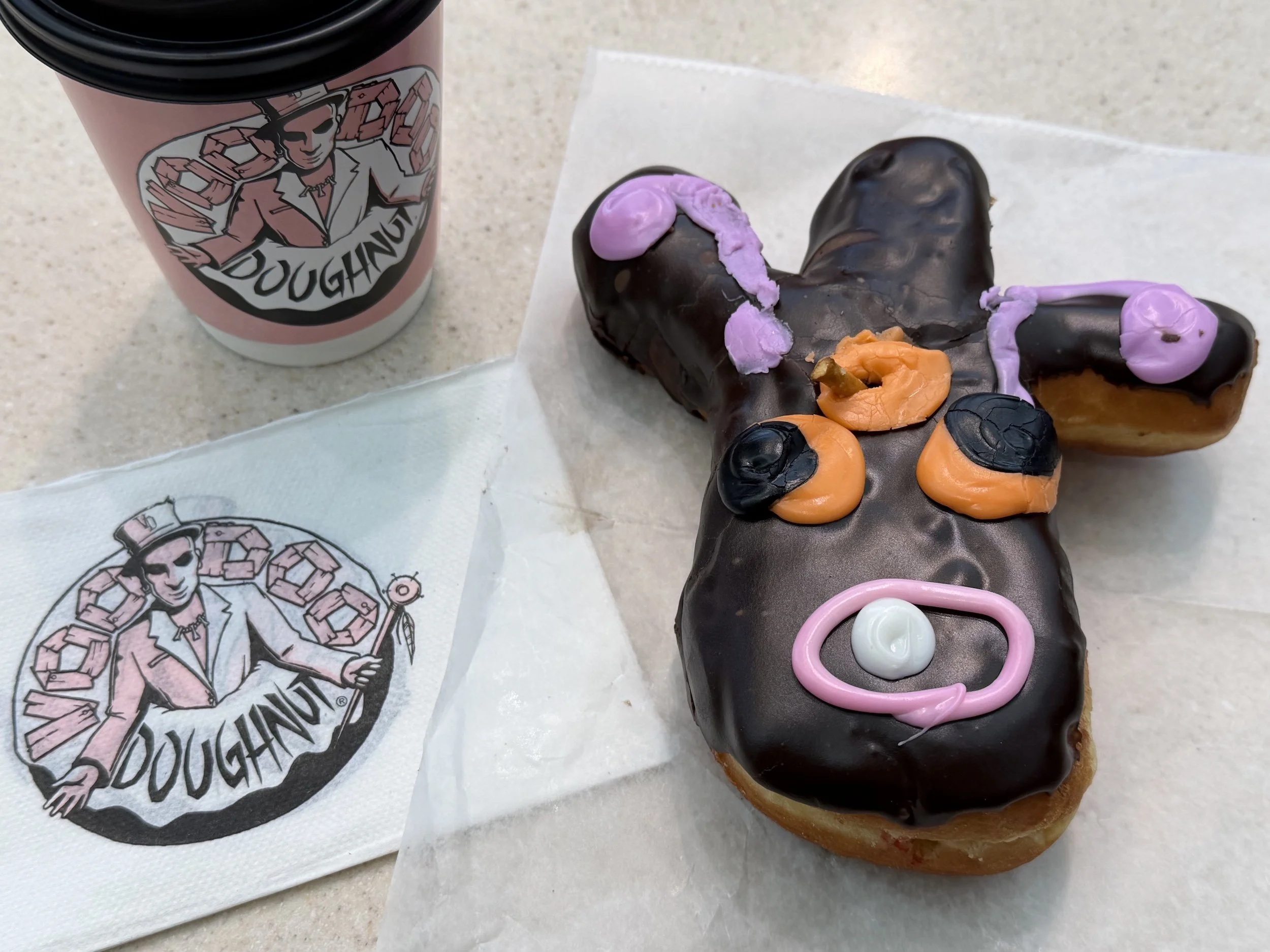 Whatever the case, I ordered the Voodoo Doll, a raspberry-filled chocolate doughnut, and the Diablos Rex, a devil’s food cake doughnut with a vanilla frosting pentagram. This was our last stateside meal, and to the extent that I am superstitious, I fully believe its emblems of witchcraft brought disaster on my family. The oversized doughnuts made my wife nauseous the more she ate, and she and my daughter both tested positive for the flu after we got back to Tokyo. I also felt sick and had a fever, though I had gotten a flu shot earlier in the winter and tested negative.