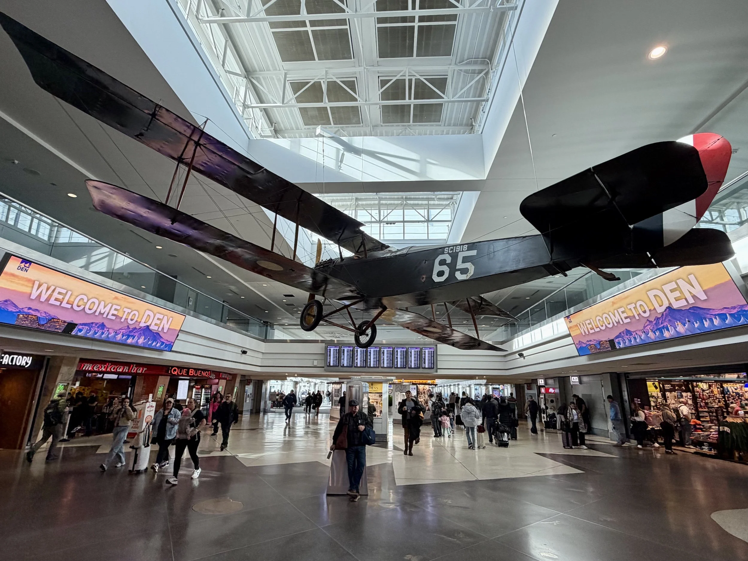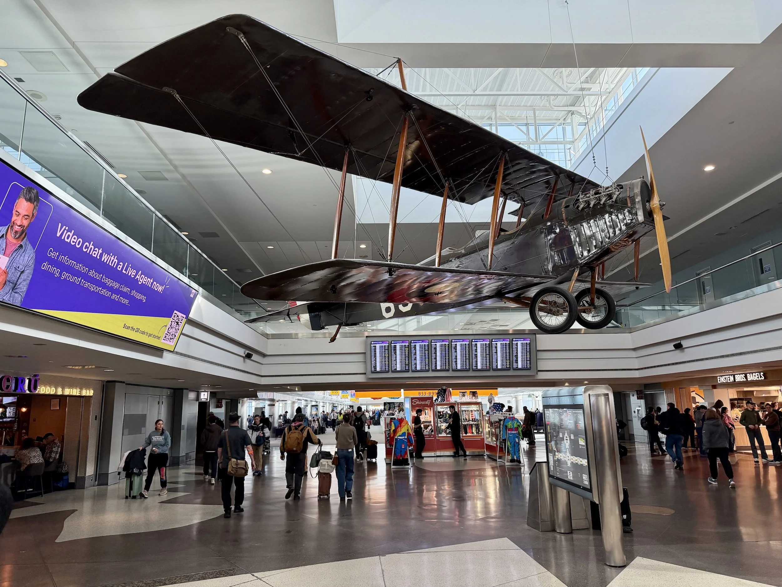 Elsewhere in Concourse B, you can see a biplane suspended from the rafters—with the airport identifying it on Facebook as a “restored 1930 Alexander Eaglerock Model A-14.” An even older relic in the same concourse is the 1918 Curtiss Jenny JN-4D, the type of plane that flew the first air mail between New York and Washington, D.C.